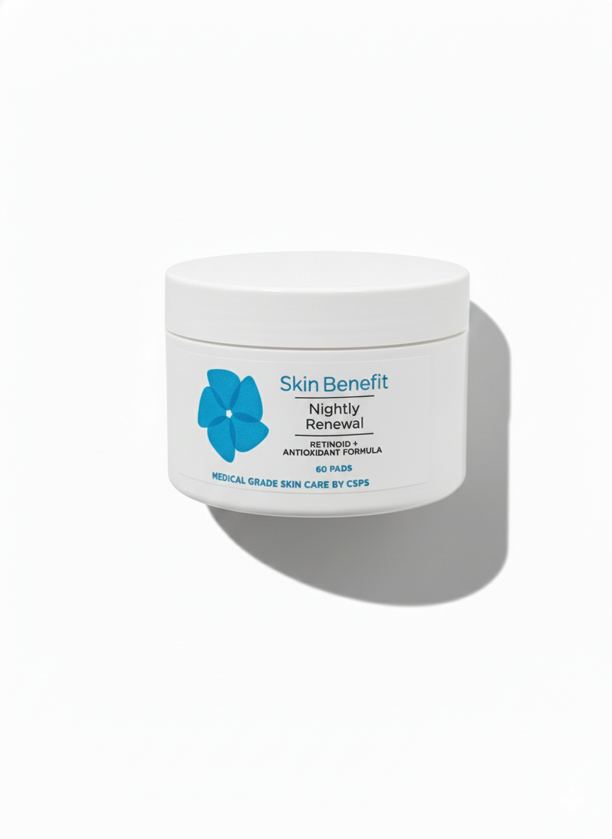 Nightly Renewal (Hydroxy acid, Antioxidant, Retinoid titration) consists of a total product regimen in 1 pad. Contains HPR retinoid, THD ascorbate vitamin C, gentle salicylic ester, squalane, vitamin E, gentle Niacinamide derivative, ferulic acid. Great way to simplify a regimen! (great for men as well).